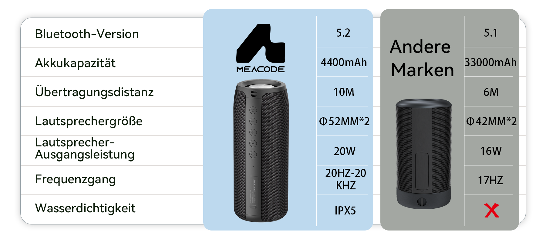 Der tragbare Bluetooth-Lautsprecher von Meacode war seine Antwort. Er liefert einen satten, kraftvollen Klang in einem ultraleichten, robusten Gehäuse. Er ist für Abenteuer konzipiert, sodass Sie Ihre Lieblingssongs genießen können, egal ob Sie auf einem Bergpfad unterwegs sind oder gerade trainieren.
